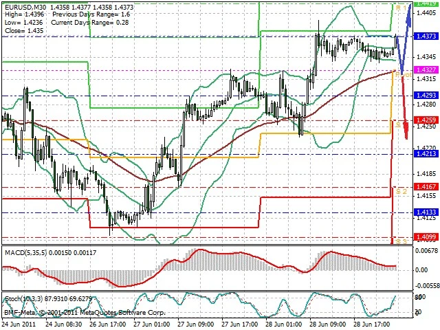 Předpokládaný pohyb pro dnešní den LONG. Případné vstupy do obchodu z hladiny 1.4325 s předpokládaným cílem 1.44, případně až 1.4455. Proražení hladiny 1.4325 může vést k pohybu s pravděpodobným cílem 1.4275 až 1.4235.