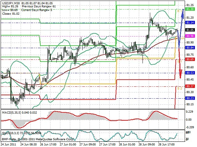 Předpokládaný pohyb pro dnešní den LONG. Případné vstupy do obchodu z hladiny 80.85 s předpokládaným cílem 81.3, případně až 81.55. Proražení hladiny 80.85 může vést k pohybu s pravděpodobným cílem 80.7 až 80.5.