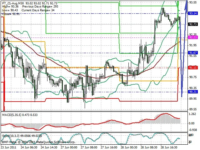 Předpokládaný pohyb pro dnešní den LONG. Případné vstupy do obchodu z hladiny 89.9 s předpokládaným cílem 94.45, případně až 95.75. Proražení hladiny 89.9 může vést k pohybu s pravděpodobným cílem 88.7 až 87.