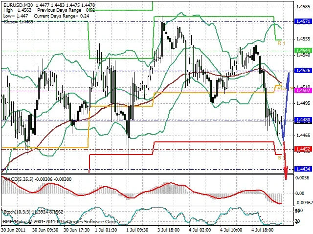 Předpokládaný pohyb pro dnešní den LONG. Případné vstupy do obchodu z hladiny 1.446 s předpokládaným cílem 1.4525, případně až 1.4555. Proražení hladiny 1.445 může vést k pohybu s pravděpodobným cílem 1.442 až 1.4375.