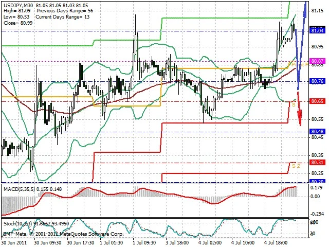 Předpokládaný pohyb pro dnešní den LONG. Případné vstupy do obchodu z hladiny 80.7 s předpokládaným cílem 81.2, případně až 81.3. Proražení hladiny 80.7 může vést k pohybu s pravděpodobným cílem 80.5 až 80.4.