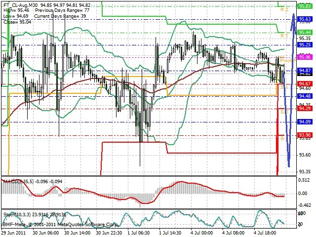 Předpokládaný pohyb pro dnešní den LONG. Případné vstupy do obchodu z hladiny 93.45 s předpokládaným cílem 95.75, případně až 97.3. Proražení hladiny 93.45 může vést k pohybu s pravděpodobným cílem 92.7 až 92.