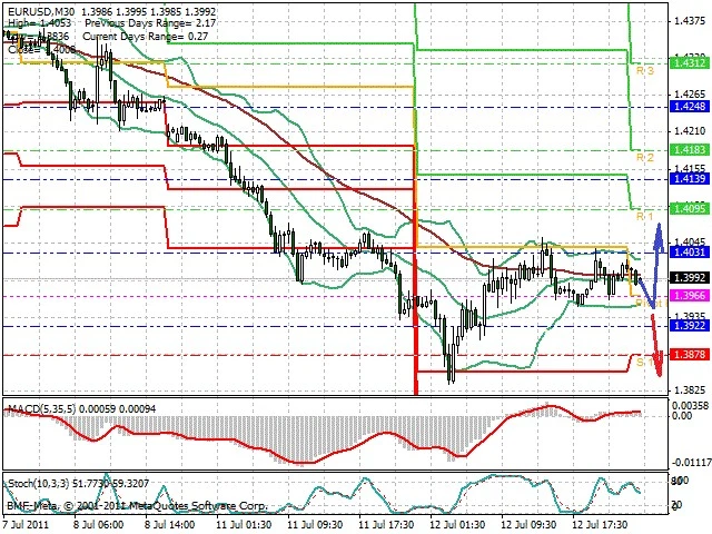 Předpokládaný pohyb pro dnešní den LONG. Případné vstupy do obchodu z hladiny 1.3955 s předpokládaným cílem 1.4065, případně až 1.412. Proražení hladiny 1.3945 může vést k pohybu s pravděpodobným cílem 1.39 až 1.384.