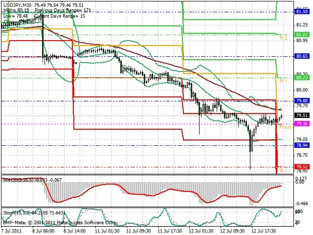 Předpokládaný pohyb pro dnešní den SHORT. Případné vstupy do obchodu z hladiny 79.85 s předpokládaným cílem 79.25, případně až 79. Proražení hladiny 79.9 může vést k pohybu s pravděpodobným cílem 80.2 až 80.4.