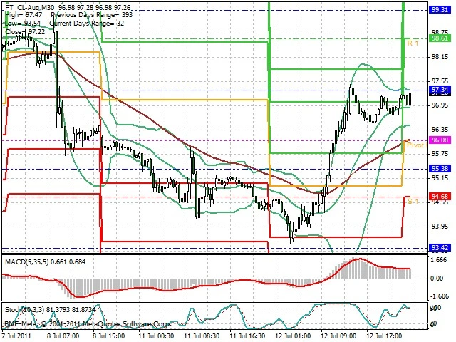 Předpokládaný pohyb pro dnešní den LONG. Případné vstupy do obchodu z hladiny 95.9 s předpokládaným cílem 97.9, případně až 98.95. Proražení hladiny 95.9 může vést k pohybu s pravděpodobným cílem 95.15 až 93.5.