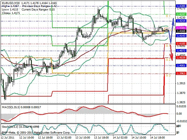 Předpokládaný pohyb pro dnešní den LONG. Případné vstupy do obchodu z hladiny 1.411 s předpokládaným cílem 1.4225, případně až 1.4285. Proražení hladiny 1.411 může vést k pohybu s pravděpodobným cílem 1.4035 až 1.395.