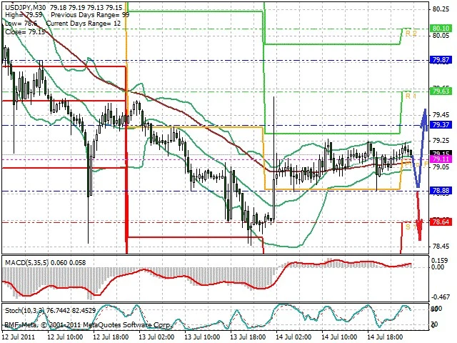Předpokládaný pohyb pro dnešní den LONG. Případné vstupy do obchodu z hladiny 78.9 s předpokládaným cílem 79.5, případně až 79.9. Proražení hladiny 78.85 může vést k pohybu s pravděpodobným cílem 78.5 až 78.2.