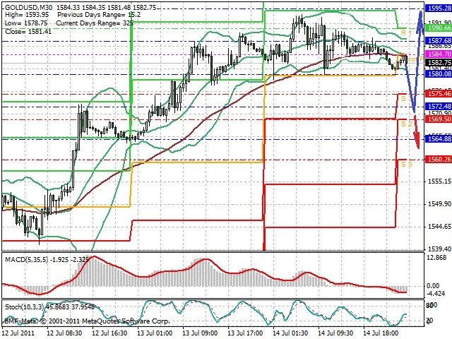 Předpokládaný pohyb pro dnešní den LONG. Případné vstupy do obchodu z hladiny 1 570 s předpokládaným cílem 1 595, případně až 1 605. Proražení hladiny 1 570 může vést k pohybu s pravděpodobným cílem 1 563 až 1 554.