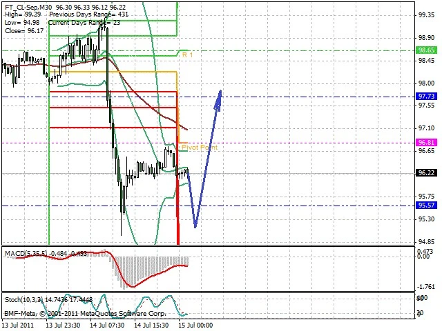 Předpokládaný pohyb pro dnešní den LONG. Případné vstupy do obchodu z hladiny 95 s předpokládaným cílem 97, případně až 98. Proražení hladiny 95 může vést k pohybu s pravděpodobným cílem 94 až 93.25.