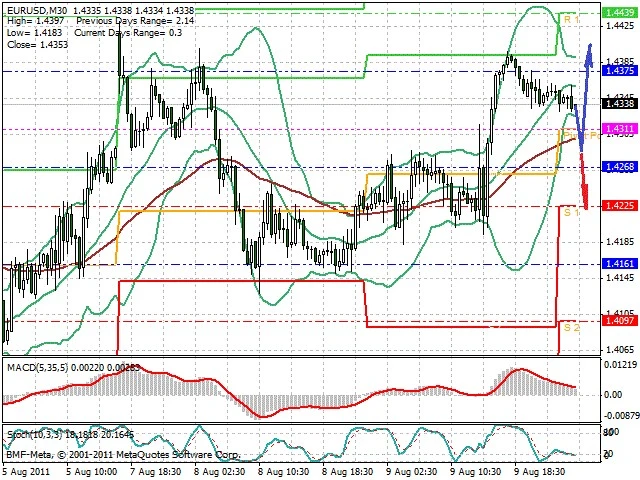 Předpokládaný pohyb pro dnešní den LONG. Případné vstupy do obchodu z hladiny 1.4285 s předpokládaným cílem 1.44, případně až 1.4455. Proražení hladiny 1.4275 může vést k pohybu s pravděpodobným cílem 1.4225 až 1.418.