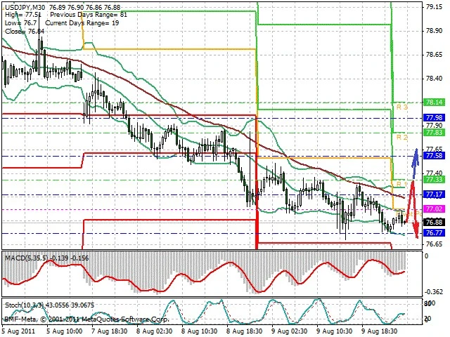Předpokládaný pohyb pro dnešní den SHORT. Případné vstupy do obchodu z hladiny 77.3 s předpokládaným cílem 76.7, případně až 76.3. Proražení hladiny 77.35 může vést k pohybu s pravděpodobným cílem 77.65 až 77.95.