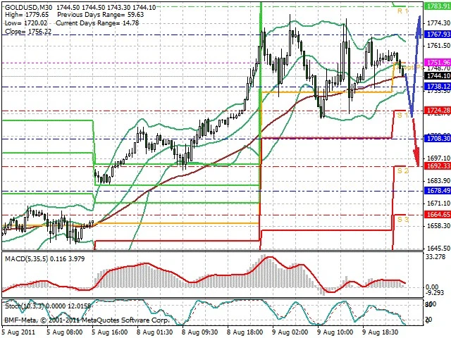 Předpokládaný pohyb pro dnešní den LONG. Případné vstupy do obchodu z hladiny 1 719 s předpokládaným cílem 1 780, případně až 1 807. Proražení hladiny 1 719 může vést k pohybu s pravděpodobným cílem 1 692 až 1 670.
