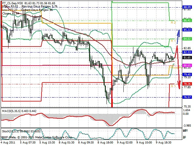 Předpokládaný pohyb pro dnešní den SHORT. Případné vstupy do obchodu z hladiny 83.3 s předpokládaným cílem 77.6, případně až 75.7. Proražení hladiny 83.3 může vést k pohybu s pravděpodobným cílem 85 až 87.