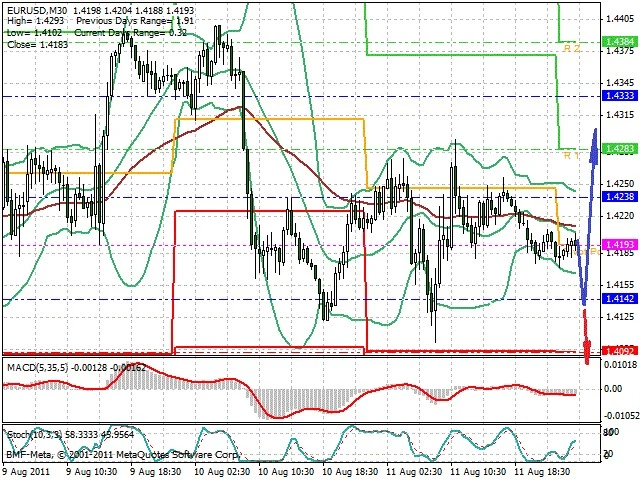 Předpokládaný pohyb pro dnešní den LONG. Případné vstupy do obchodu z hladiny 1.4135 s předpokládaným cílem 1.431, případně až 1.4375. Proražení hladiny 1.4125 může vést k pohybu s pravděpodobným cílem 1.4085 až 1.4055.
