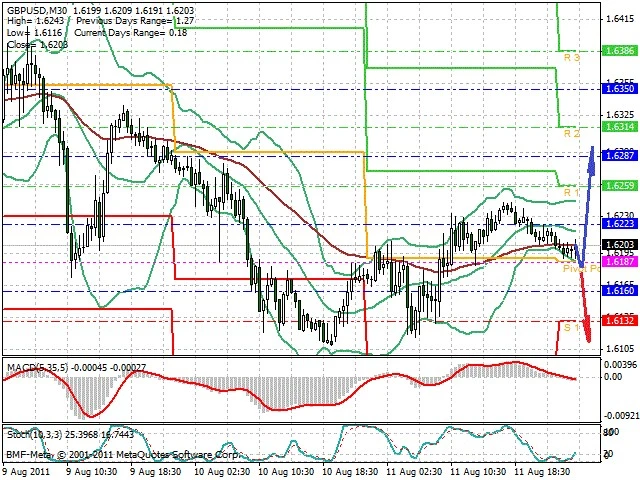 Předpokládaný pohyb pro dnešní den LONG. Případné vstupy do obchodu z hladiny 1.6185 s předpokládaným cílem 1.625, případně až 1.63. Proražení hladiny 1.6175 vést k pohybu s pravděpodobným cílem 1.611 až 1.605.