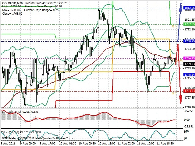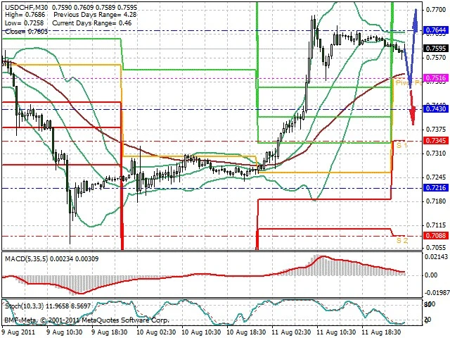 Předpokládaný pohyb pro dnešní den LONG. Případné vstupy do obchodu z hladiny 0.75 s předpokládaným cílem 0.77, případně až 0.78. Proražení hladiny 0.749 může vést k pohybu s pravděpodobným cílem 0.74 až 0.73.