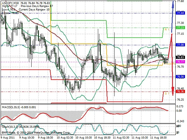 Předpokládaný pohyb pro dnešní den SHORT. Případné vstupy do obchodu z hladiny 77.15 s předpokládaným cílem 76.3, případně až 76. Proražení hladiny 77.2 může vést k pohybu s pravděpodobným cílem 77.75 až 78.4.