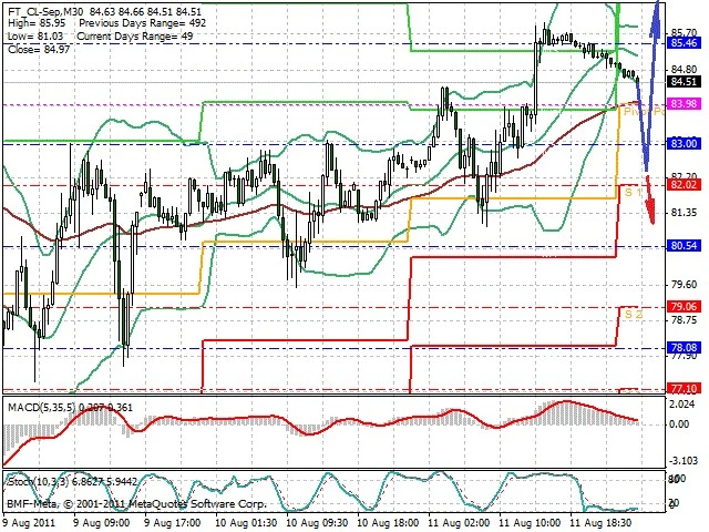 Předpokládaný pohyb pro dnešní den LONG. Případné vstupy do obchodu z hladiny 82.3 s předpokládaným cílem 87.3, případně až 90.25. Proražení hladiny 82.3 může vést k pohybu s pravděpodobným cílem 80.7 až 79.5.
