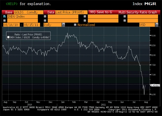 V minulém týdnu se tento poměr dostal ve spotových (cash) hodnotách na 10604/1818,60 - tedy na poměrový ukazatel 5,83. Přesnější poměr ve futures (tedy termínovaných měsíčních kontraktech zachycující průběžnou aktivitu traderů i mimo oficiální denní seanci), dosáhl v období září - srpen hodnoty 5,736. A ve více likvidních kontraktech (září-srpen) se poměr Dow Jones/Zlato dostal v úterý a ve středu v noci přímo k hodnotě 5,75.