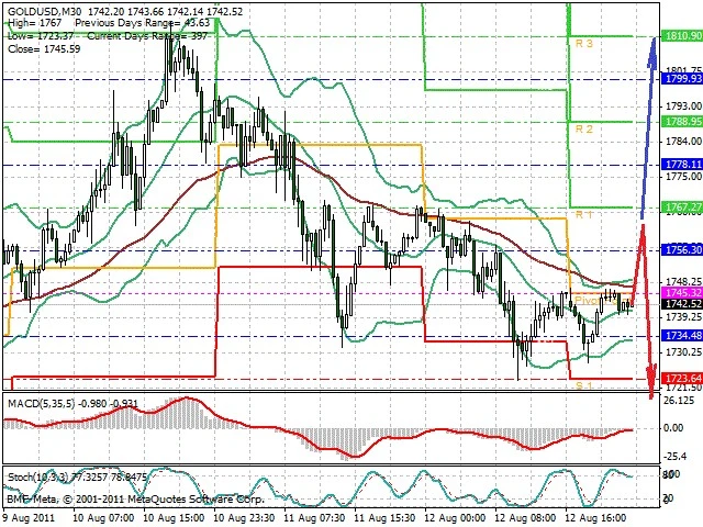 Předpokládaný pohyb pro dnešní den LONG. Případné vstupy do obchodu z hladiny 1 745 s předpokládaným cílem 1 780, případně až 1 796. Proražení hladiny 1 745 může vést k pohybu s pravděpodobným cílem 1 725 až 1 700.