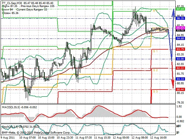 Předpokládaný pohyb pro dnešní den LONG. Případné vstupy do obchodu z hladiny 85 s předpokládaným cílem 90.25, případně až 92.85. Proražení hladiny 85 může vést k pohybu s pravděpodobným cílem 82.85 až 80.7.