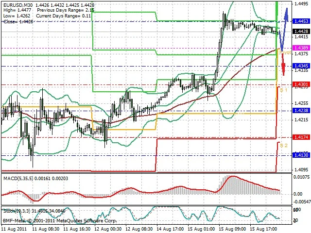 Předpokládaný pohyb pro dnešní den LONG. Případné vstupy do obchodu z hladiny 1.4385 s předpokládaným cílem 1.4475, případně až 1.454. Proražení hladiny 1.4375 může vést k pohybu s pravděpodobným cílem 1.4325 až 1.4275.