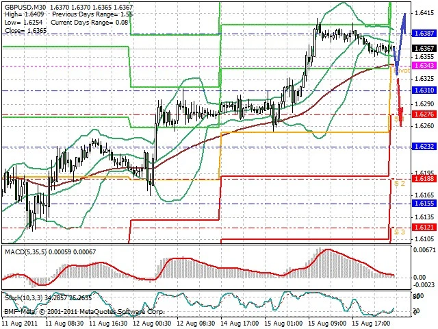 Předpokládaný pohyb pro dnešní den LONG. Případné vstupy do obchodu z hladiny 1.6335 s předpokládaným cílem 1.641, případně až 1.645. Proražení hladiny 1.6325 vést k pohybu s pravděpodobným cílem 1.6265 až 1.6235.