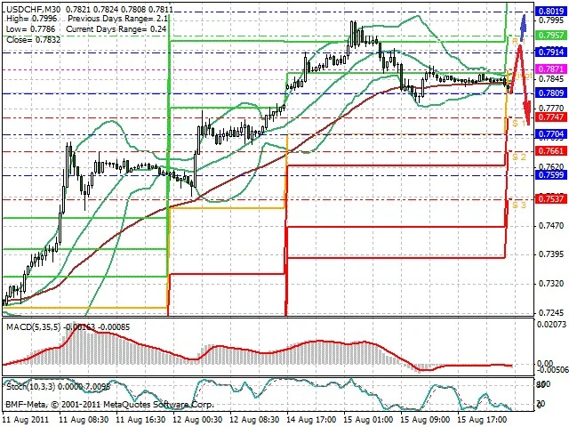 Předpokládaný pohyb pro dnešní den SHORT. Případné vstupy do obchodu z hladiny 0.7925 s předpokládaným cílem 0.7795, případně až 0.768. Proražení hladiny 0.793 může vést k pohybu s pravděpodobným cílem 0.7995 až 0.8045.