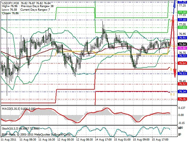 Předpokládaný pohyb pro dnešní den SHORT. Případné vstupy do obchodu z hladiny 77.15 s předpokládaným cílem 76.5, případně až 76.3. Proražení hladiny 77.2 může vést k pohybu s pravděpodobným cílem 77.5 až 77.75.