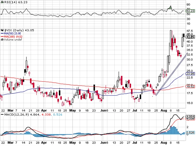 Index volatility VIX se drží na vysokých hodnotách, i když v pátek sestoupil o více než 10 %. Zatím se drží nad rostoucí trendovou čárou, ale stejně jako index S&P 500 nemá jasný směr.