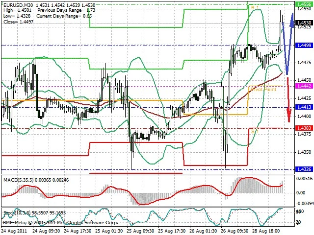 Předpokládaný pohyb pro dnešní den LONG. Případné vstupy do obchodu z hladiny 1.446 s předpokládaným cílem 1.454, případně až 1.458. Proražení hladiny 1.445 může vést k pohybu s pravděpodobným cílem 1.4395 až 1.433.