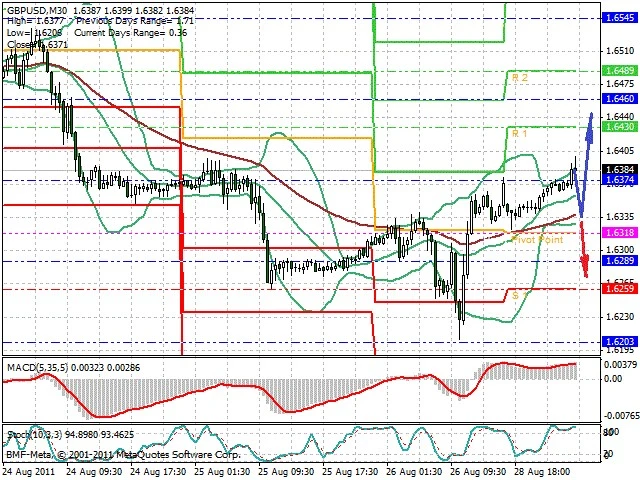 Předpokládaný pohyb pro dnešní den LONG. Případné vstupy do obchodu z hladiny 1.6335 s předpokládaným cílem 1.64, případně až 1.6445. Proražení hladiny 1.6325 vést k pohybu s pravděpodobným cílem 1.6275 až 1.621.