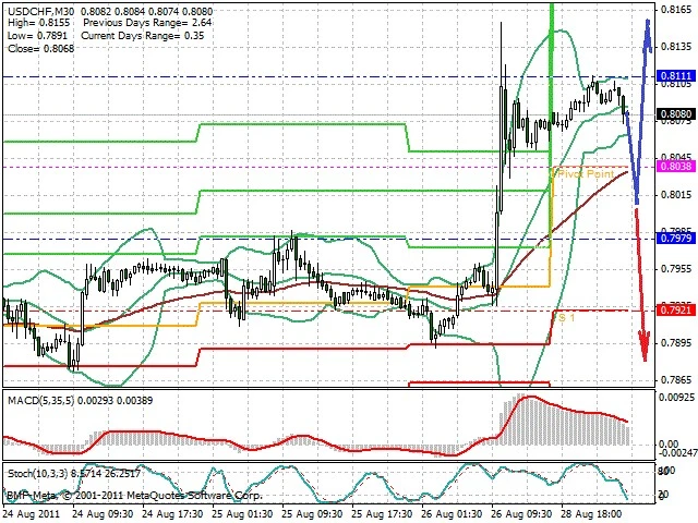 Předpokládaný pohyb pro dnešní den LONG. Případné vstupy do obchodu z hladiny 0.803 s předpokládaným cílem 0.816, případně až 0.824. Proražení hladiny 0.803 může vést k pohybu s pravděpodobným cílem 0.7975 až 0.789.