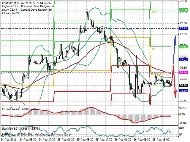 Předpokládaný pohyb pro dnešní den SHORT. Případné vstupy do obchodu z hladiny 76.95 s předpokládaným cílem 76.5, případně až 76.3. Proražení hladiny 77 může vést k pohybu s pravděpodobným cílem 77.3 až 77.5.