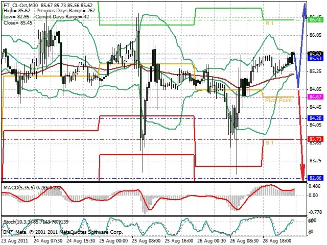 Předpokládaný pohyb pro dnešní den LONG. Případné vstupy do obchodu z hladiny 82.9 s předpokládaným cílem 86.6, případně až 88.2. Proražení hladiny 82.9 může vést k pohybu s pravděpodobným cílem 81.7 až 81.2.