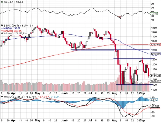 V pondělí byl ve Spojených státech "Labor Day" a k výraznému signalizovanému poklesu opravdu došlo a cena v pátek uzavřela na 1 154 bodech, tedy průměrné korekci sezónního paternu (minulý týden bylo zmiňováno 1 156). Na grafu indexu S&P 500 se vytvořila kanálová formace vlajka. Prolomení pod spodní linii bude velmi negativní technickou formací. Na druhou stranu je blízko, v oblasti 1 120 až 1 100, silná hladina odporu, kde je ještě šance na zastavení sestupu.