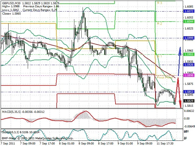 Předpokládaný pohyb pro dnešní den SHORT. Případné vstupy do obchodu z hladiny 1.589 s předpokládaným cílem 1.581, případně až 1.575. Proražení hladiny 1.59 může vést k pohybu s pravděpodobným cílem 1.597 až 1.6.