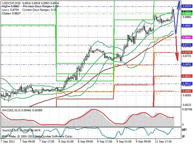 Předpokládaný pohyb pro dnešní den LONG. Případné vstupy do obchodu z hladiny 0.882 s předpokládaným cílem 0.902, případně až 0.915. Proražení hladiny 0.881 může vést k pohybu s pravděpodobným cílem 0.87 až 0.863.