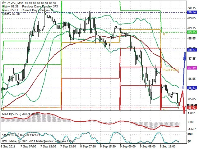 Předpokládaný pohyb pro dnešní den SHORT. Případné vstupy do obchodu z hladiny 86.35 s předpokládaným cílem 85, případně až 84.4. Proražení hladiny 86.35 může vést k pohybu s pravděpodobným cílem 88.25 až 89.4.