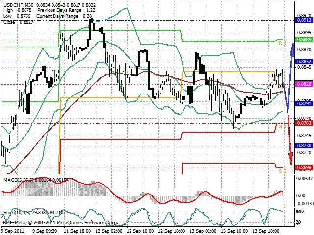 Předpokládaný pohyb pro dnešní den LONG. Případné vstupy do obchodu z hladiny 0.878 s předpokládaným cílem 0.888, případně až 0.893. Proražení hladiny 0.877 může vést k pohybu s pravděpodobným cílem 0.87 až 0.863.