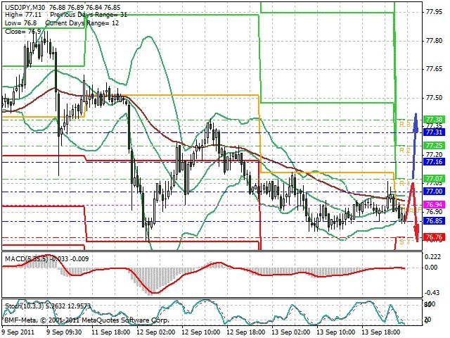 Předpokládaný pohyb pro dnešní den SHORT. Případné vstupy do obchodu z hladiny 77 s předpokládaným cílem 76.75, případně až 76.55. Proražení hladiny 77.1 může vést k pohybu s pravděpodobným cílem 77.4 až 77.65.