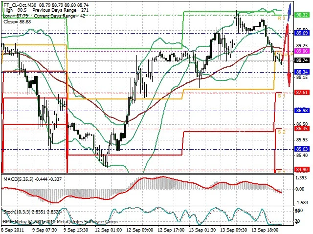 Předpokládaný pohyb pro dnešní den SHORT. Případné vstupy do obchodu z hladiny 89.95 s předpokládaným cílem 87.8, případně až 87.1. Proražení hladiny 89.95 může vést k pohybu s pravděpodobným cílem 90.45 až 91.
