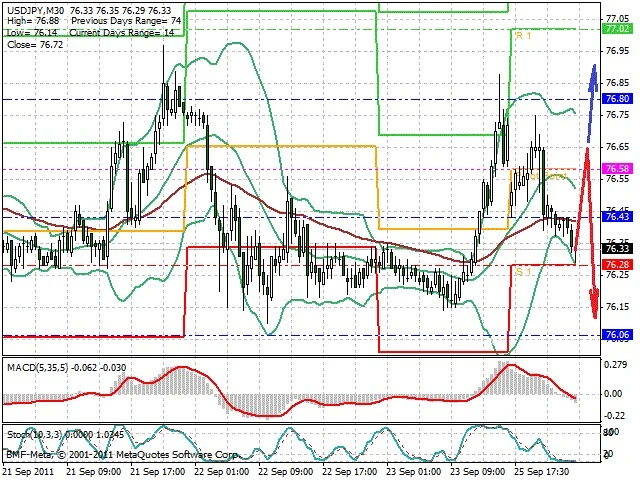 Předpokládaný pohyb pro dnešní den SHORT. Případné vstupy do obchodu z hladiny 76.65 s předpokládaným cílem 76.1, případně až 75.95. Proražení hladiny 76.7 může vést k pohybu s pravděpodobným cílem 76.9 až 77.1.