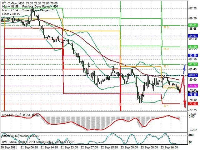 Předpokládaný pohyb pro dnešní den SHORT. Případné vstupy do obchodu z hladiny 80.85 s předpokládaným cílem 77.5 případně až 76.6. Proražení hladiny 80.85 může vést k pohybu s pravděpodobným cílem 81.7 až 83.4.