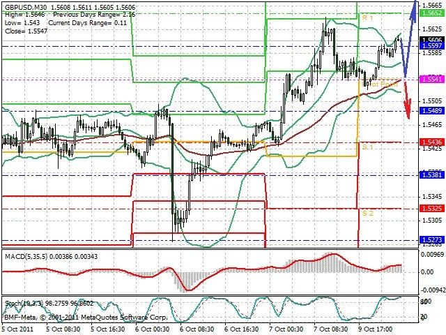 Předpokládaný pohyb pro dnešní den LONG. Případné vstupy do obchodu z hladiny 1.5545 s předpokládaným cílem 1.5675, případně až 1.5715. Proražení hladiny 1.553 může vést k pohybu s pravděpodobným cílem 1.5475 až 1.543.