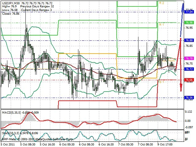 Předpokládaný pohyb pro dnešní den SHORT. Případné vstupy do obchodu z hladiny 76.9 s předpokládaným cílem 76.6, případně až 76.5. Proražení hladiny 76.95 může vést k pohybu s pravděpodobným cílem 77.1 až 77.2.