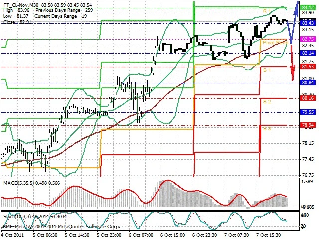 Předpokládaný pohyb pro dnešní den LONG. Případné vstupy do obchodu z hladiny 82.5 s předpokládaným cílem 84.55 případně až 86.25. Proražení hladiny 82.5 může vést k pohybu s pravděpodobným cílem 81 až 79.6.