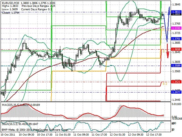 Předpokládaný pohyb pro dnešní den LONG. Případné vstupy do obchodu z hladiny 1.369 s předpokládaným cílem 1.383, případně až 1.3875. Proražení hladiny 1.369 může vést k pohybu s pravděpodobným cílem 1.3615 až 1.357.
