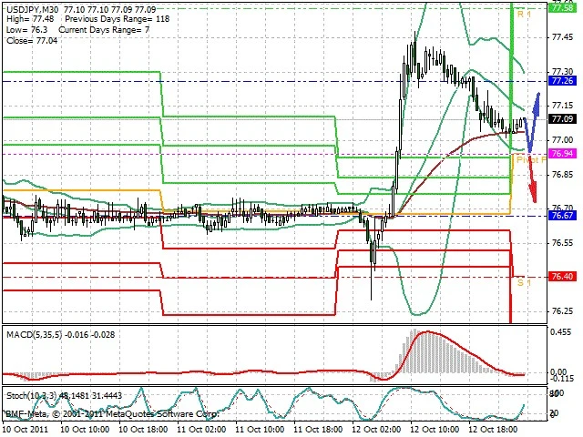 Předpokládaný pohyb pro dnešní den LONG. Případné vstupy do obchodu z hladiny 76.95 s předpokládaným cílem 77.2, případně až 77.4. Proražení hladiny 76.95 může vést k pohybu s pravděpodobným cílem 76.75 až 76.5.