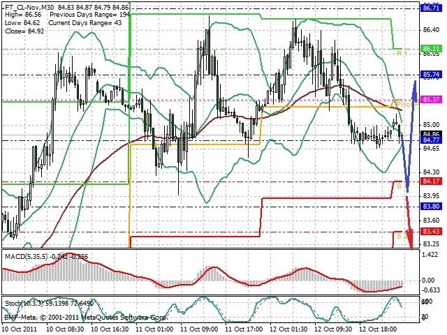 Předpokládaný pohyb pro dnešní den LONG. Případné vstupy do obchodu z hladiny 84 s předpokládaným cílem 85.65 případně až 86.75. Proražení hladiny 84 může vést k pohybu s pravděpodobným cílem 82 až 81.5.